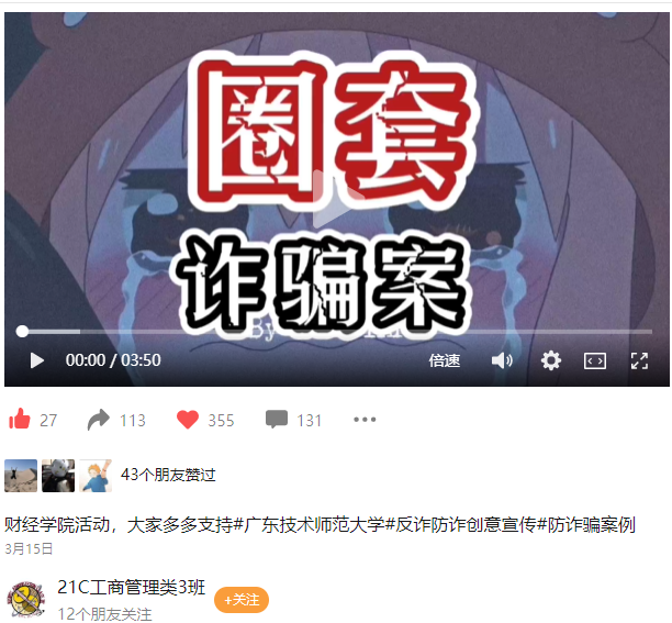 自活动开展以来,21级的14个班集体积极踊跃地组织有关反诈防诈的主题班会并在各班班委地组织下拍摄出别具一格的宣传视频。拍摄结束后,各班的参赛作品被广泛地分享到微信群和朋友圈。截至3月15日,通过对各班提交的班级微信视频号数据统计得出了短视频热度指数的前三名,分别是21工管3班、21工管4班和21税收2班。同时,21金融3班的宣传视频被作为特别推荐而展出。
