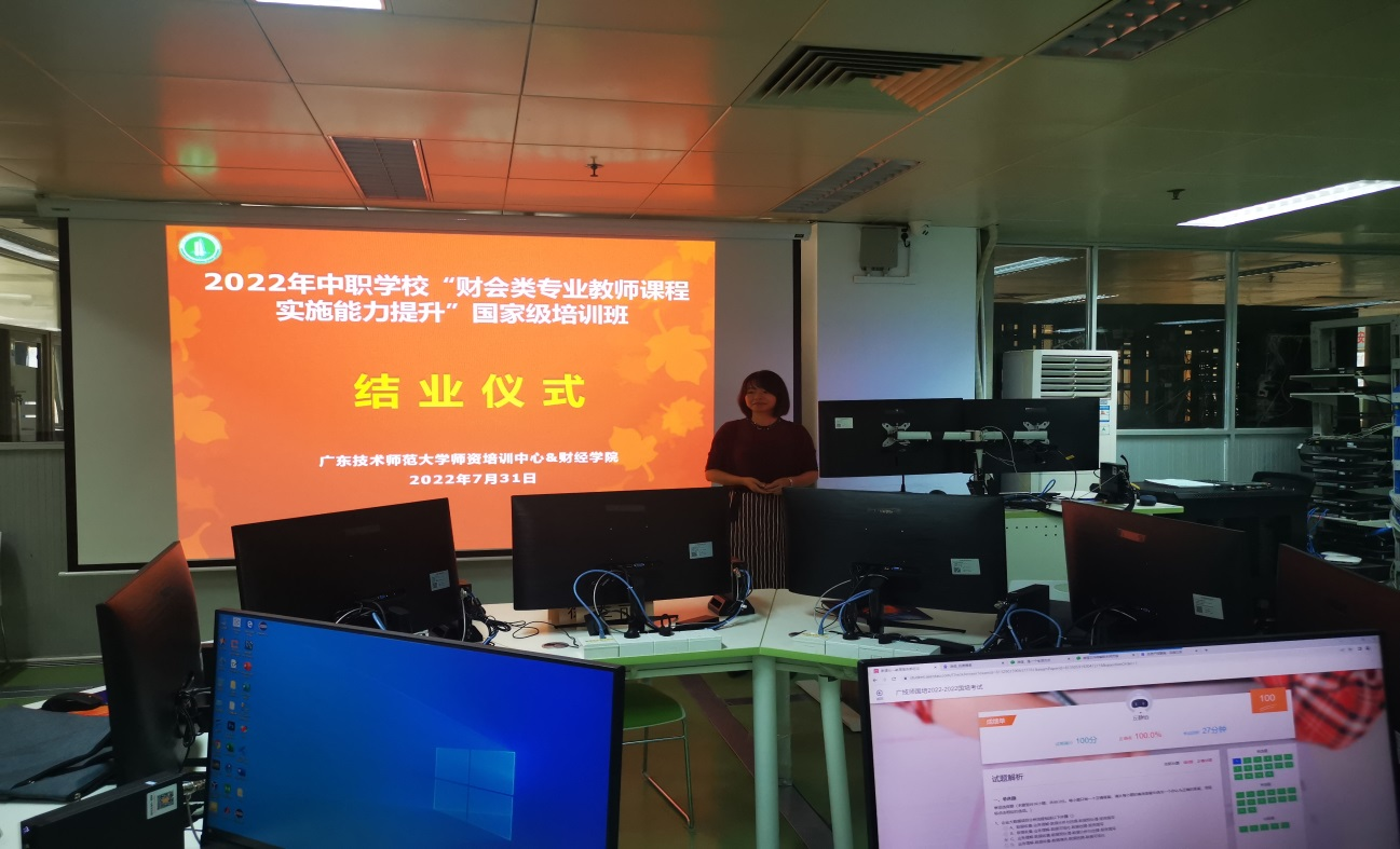 结业典礼再回首,收获良多。结业典礼上,参与研讨交流的学员代表们纷纷表示非常感谢教育部门和公司举办了本期国培班,对精心安排本次培训的公司领导老师以及授课教师们表示十分满意与感激之情。学员代表们认为通过本次培训,开阔了专业知识领域视野,更新了传统教学理念,厘清了财会专业人才培养发展的思路,也提升了专业课程建设与实施的教学能力。随后,周清副经理用精美PPT放映形式回顾总结了本次培训教师与学员共同学习交流的内容与温馨画面。她对参训学员提出了几点希望:一,学以致用,阶段性树立提升目标,每天进步一点点;二,增强体魄,完成教学工作任务之余要注意加强锻炼身体,劳逸结合;三,保持自信,保持对教学工作的热爱,对自己的教学能力要有信心,对员工要有耐心。最后,周清还送学员们一句话作为互勉“广技师范,润心励志,中职师者,聚力笃行。”