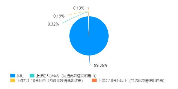 开学以来,同学们均能够按学校学院要求准时上课,能做到全勤参与网络教学,整体态度良好、有序签到、纪律优良。由以下上饼图可见99.36%的人都能按时签到,少部分人因为一些原因无法按时签到。在上课后5分钟至10分钟以内签到的主要原因是软件系统崩溃、网速慢等;而有部分同学在上课后10分钟以内仍未签到,主要原因是还不适应新型的网络授课模式,自身的学习状态尚未调整过来。此后相信财经学子会迅速适应新型授课模式。
